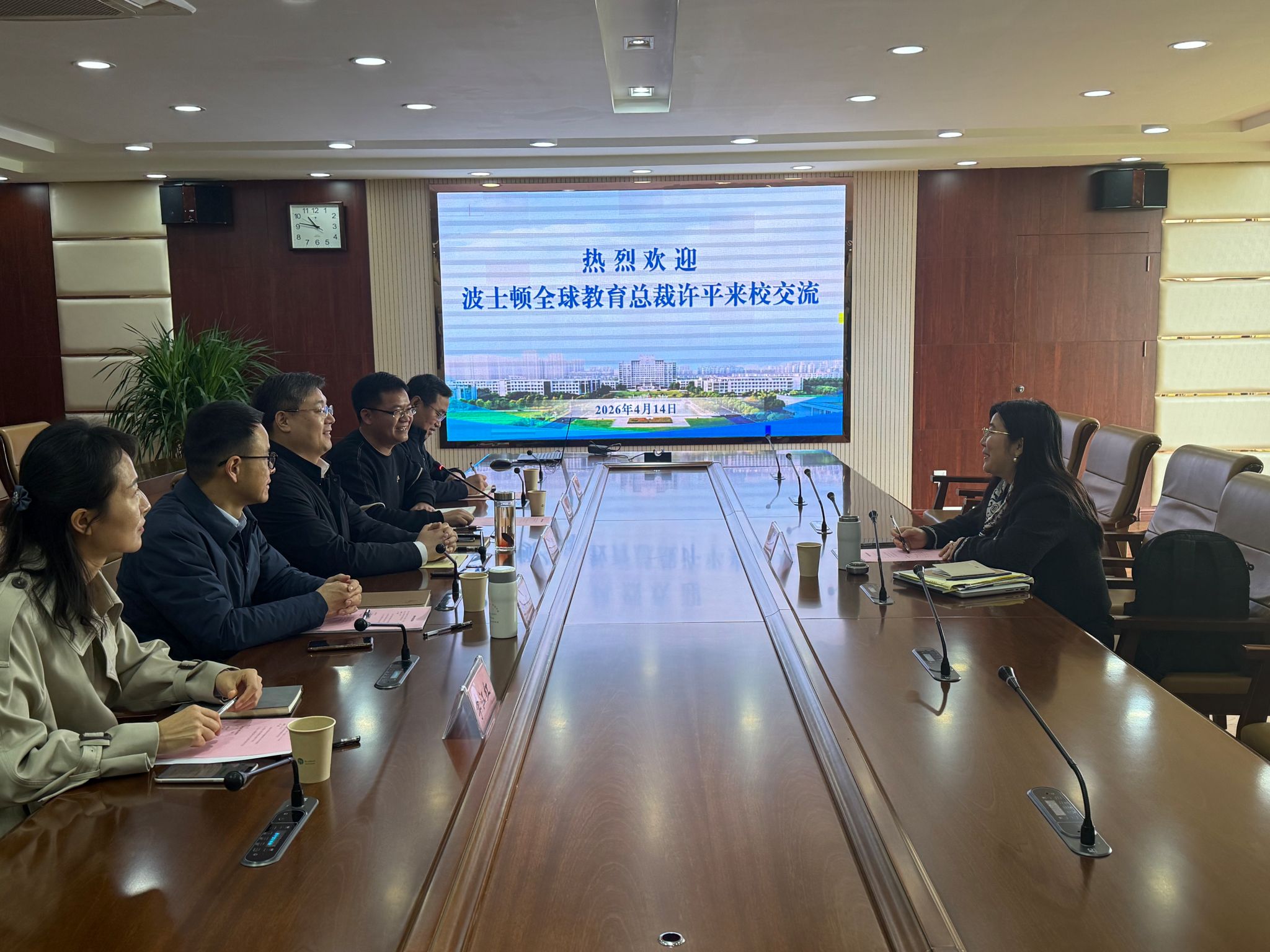 4月14日上午,美国波士顿全球教育总裁许平来校访问交流。校党委常委、副校长张灏出席交流会并致辞,国际处处长洪坤主持会议。