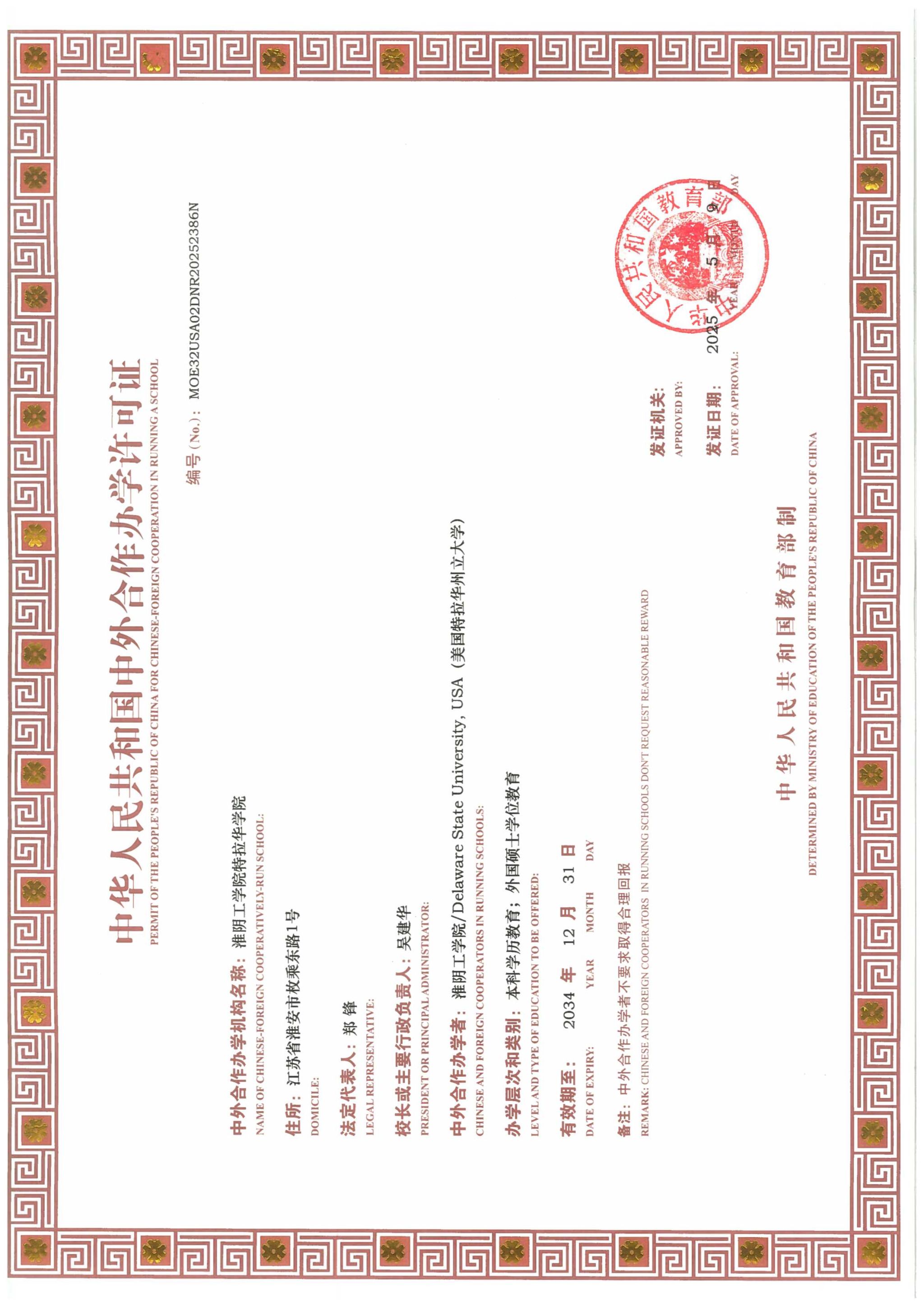 教育部中外合作办学机构许可证(淮阴工学院特拉华学院)